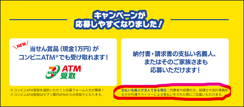 法人に請求が来た税金を法人が払うのが普通なので、わざわざ個人で立て替えることはしません。そのような法人はキャンペーンに応募できません。法人口座でペイジーを引き落として使うのは便利なので、法人も対象にすればいいのにって思いますね。