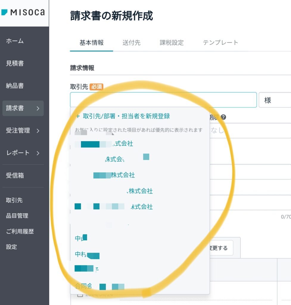 Misocaでは一度請求書を発行すると相手先の情報が残ります。2回目の請求書を発行するときに予測リストを出してくれます。