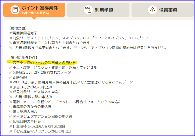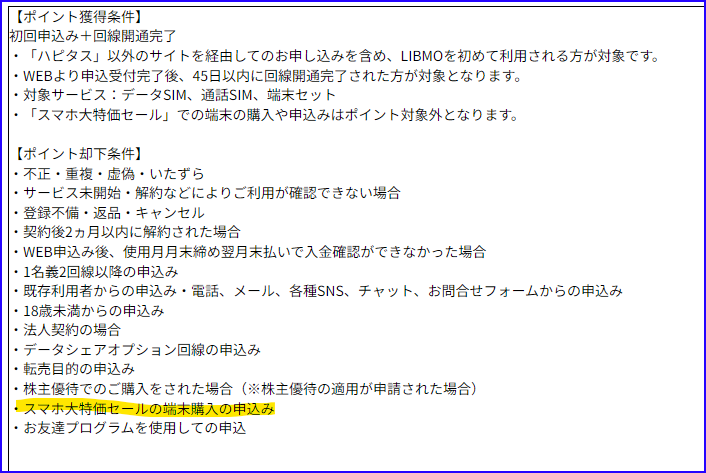 リブモにはスマホ大特価セールのページがあり、回線とセットで申し込むと端末を安く買うことができます。でも、ポイントサイトでは端末セットでの申し込みはポイント付与の対象から外れると明記されています。