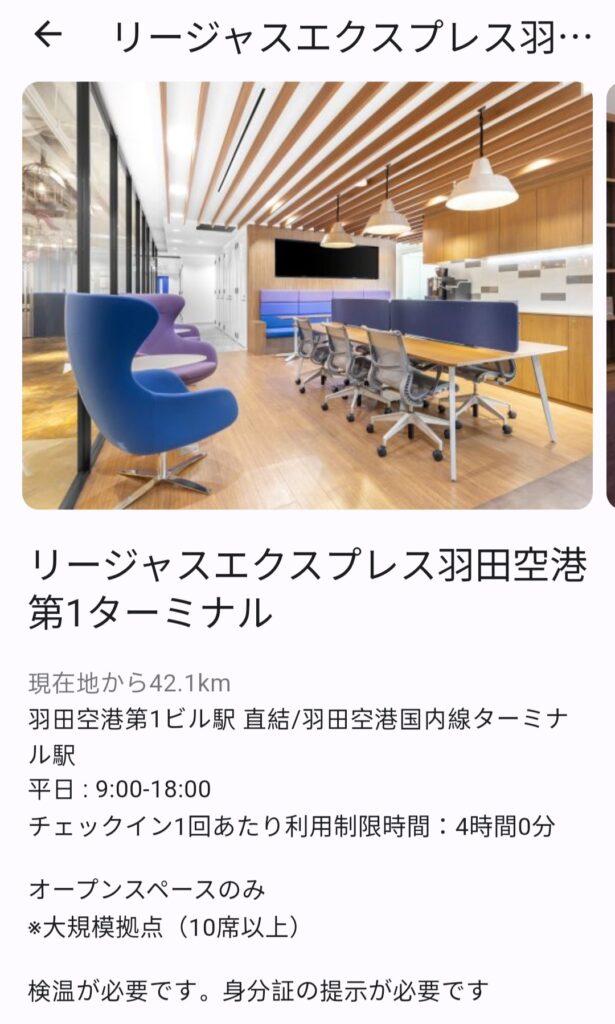 日経オフィスパスは使えるオフィスがたくさんあるのが売りなのですが、羽田空港で使えるオフィスはリージャスしかありません。