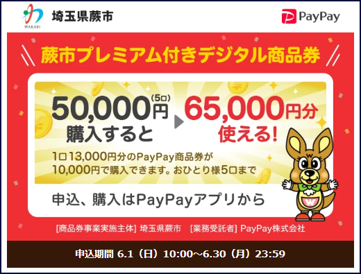 ここ数年はあまり盛り上がっていませんが、数年前まではスマホQR決済アプリのキャンペーンはポイ活の主流でした。盛り上がりのピークは過ぎた感じがありますが、まだまだ大量の広告費が投入されているキャンペーンもあるため、定期的にチェックしておくといいでしょう。この記事の投稿時点では埼玉県蕨市のプレミアム商品券を買うと30%還元のキャンペーンをやっていました。