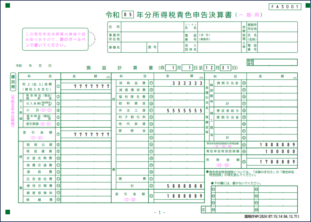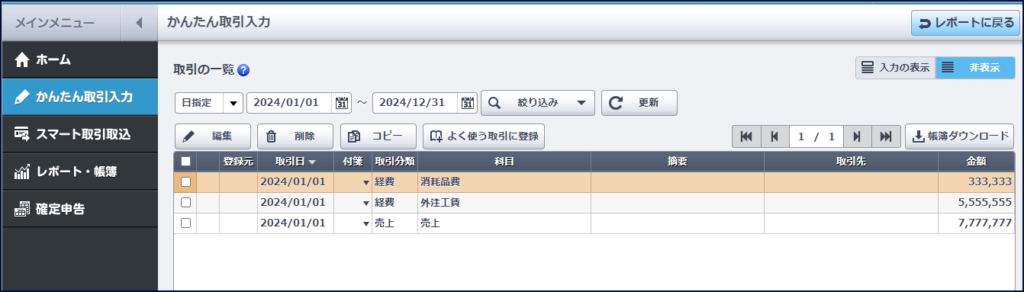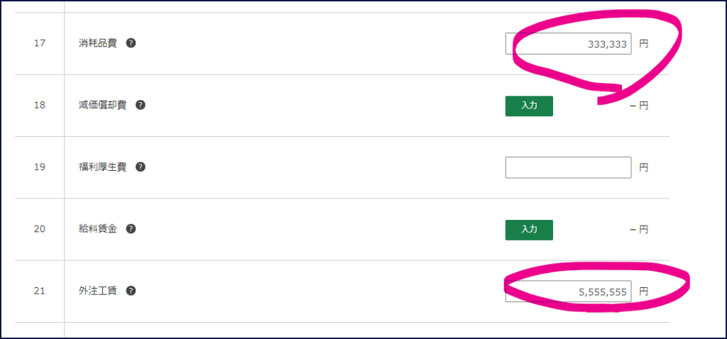 今回は、売上7,777,777円、外注費5,555,555円、消耗品費333,333円を手入力しました。