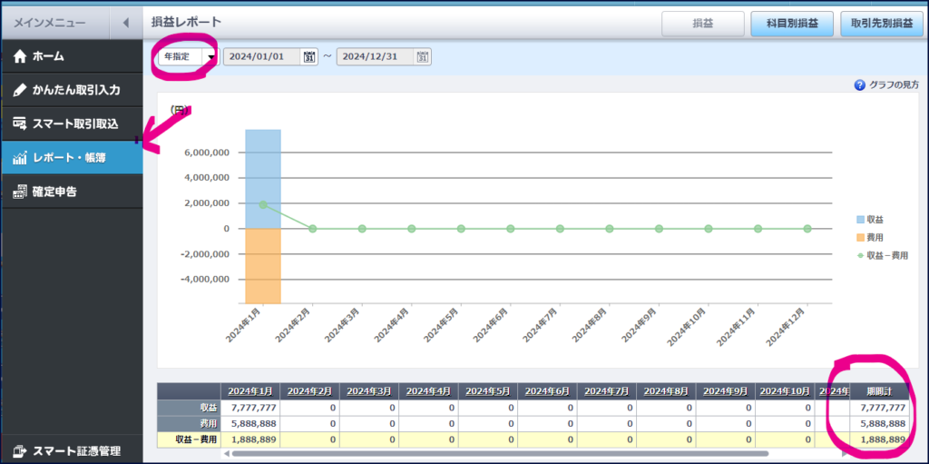 レポート帳簿メニューから損益レポートに進み、年指定を選択します。そうすると、1年分の売上と経費の合計値が出ます。